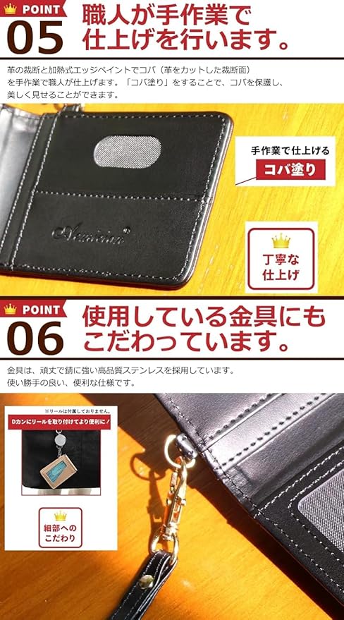 ✨【高い縫製技術を施しています】革製品で培った丁寧な縫製技術。試作品で改良したのは、構造上でダメージを受けやすい箇所の二重縫製と、高強度の糸を厳選したことです。【こだわっている金具】金具は、頑丈で錆びに強い高品質ステンレスを採用しています。使い勝手の良い、便利な仕様です。パスケースに装備したDカンにリールを取り付けてより便利!【リール付き】リールを伸ばして(最大で約40CM)センサーにタッチ、使い終わって手を離すと自動的にリールがもどるので首から下げたままセキュリティカードなどをタッチすることが可能です。