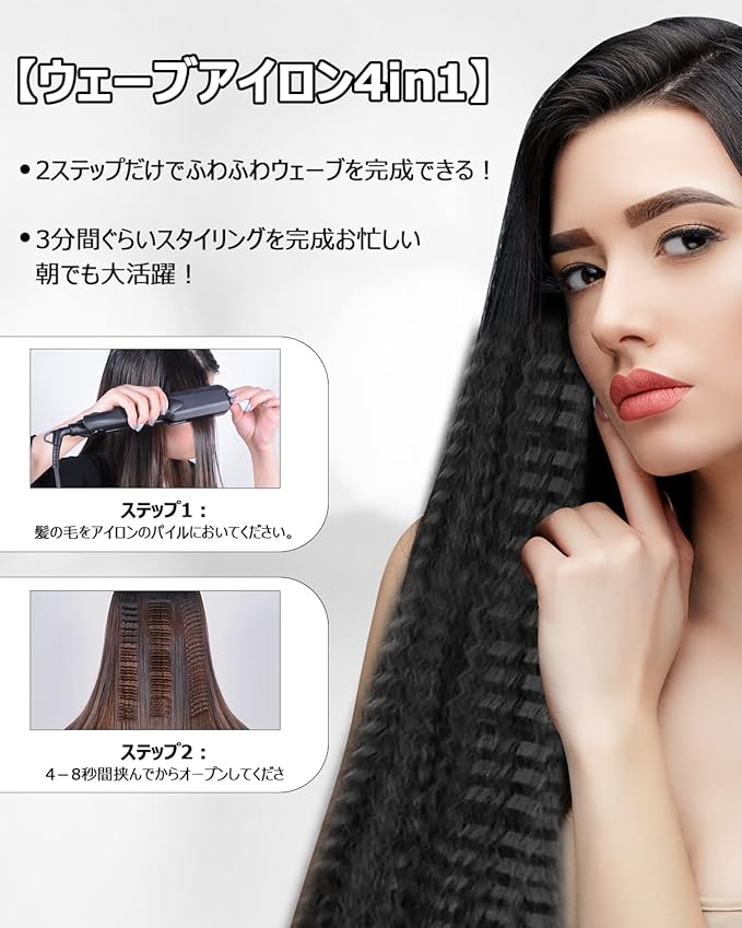 【4in1多機能ヘアアイロン】このワッフルアイロンは4つ交換可能な滑りよいセラミックプレート付き、髪摩擦が少ないのために、ヘアにダメージもを減少し、さらツヤ髪を手に入れます。ストレート・カール・ウェーブがこれ1本で実現。