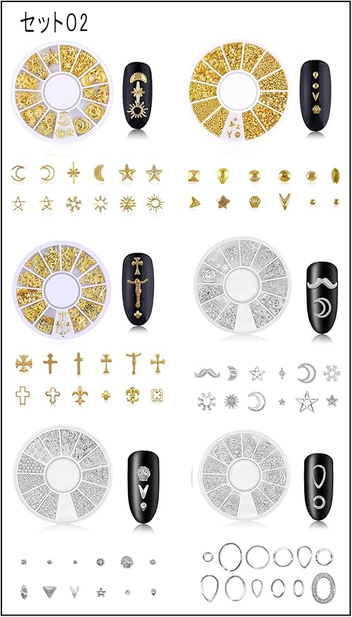 豊富なデザイン: 様々な金属製の装飾パーツが入っており、クロス、星、月、その他のモチーフで構成されています。