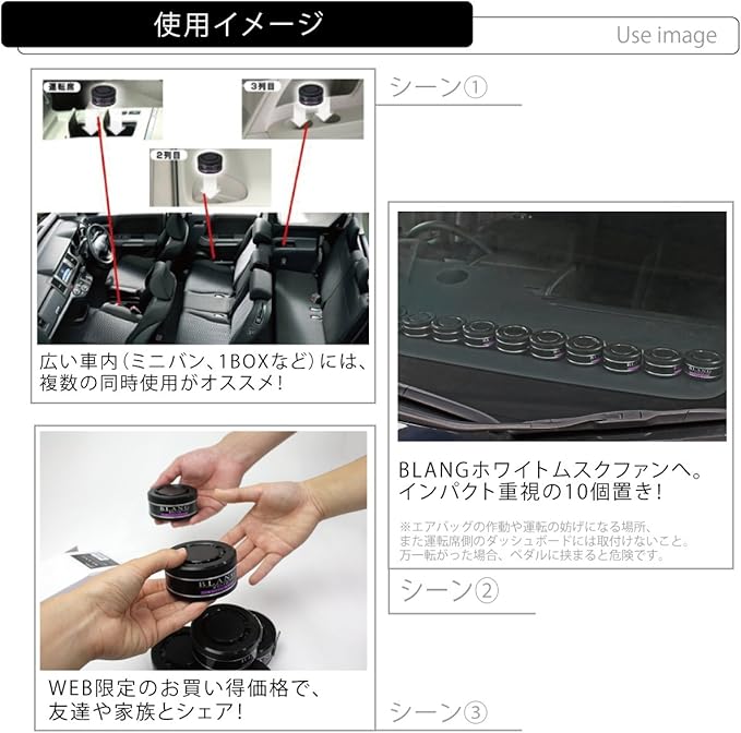 ●飲用不可●用途以外には使用しないこと●エアバッグの作動や運転の妨げになる場所、または運転席側のダッシュボードや足元には取付けないこと(万が一転がった場合、ペダルにはさまると危険です)●表皮が柔らかいダッシュボード(ポリウレタン製等)は、経年劣化等により、粘着テープをはがす際、破損するおそれがあるので、ダッシュボード以外の場所に貼付けてご使用ください●植毛、布地面には貼付け不可