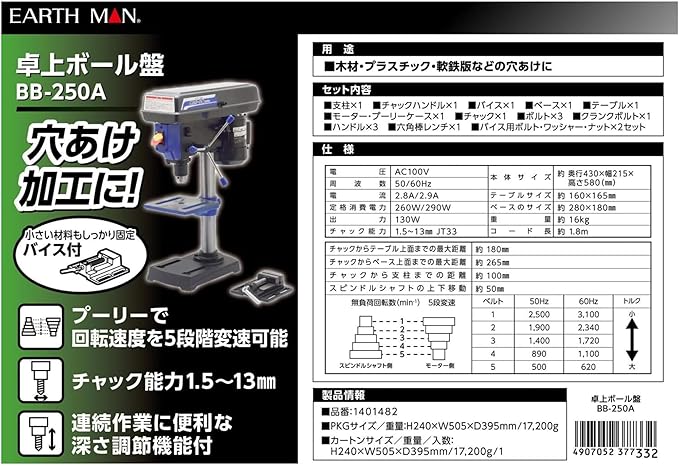 高儀(Takagi) EARTH MAN 卓上ボール盤 卓上ドリル 旋盤 フライス盤 ドリルスタンド 固定バイス付き 回転速度5段階 深さ調節 可変速 BB-250A