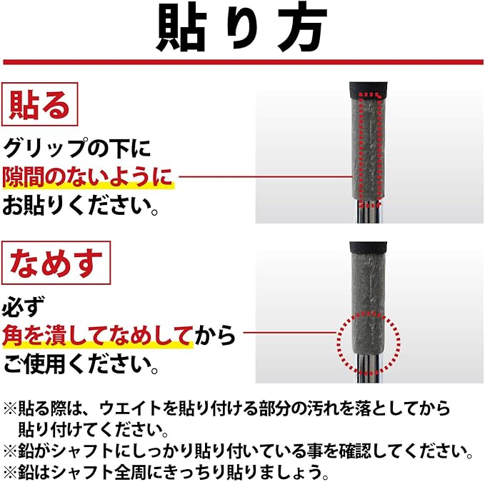 シャフトに鉛を貼ることで全体のバランスが変化させずに、重量アップができます。