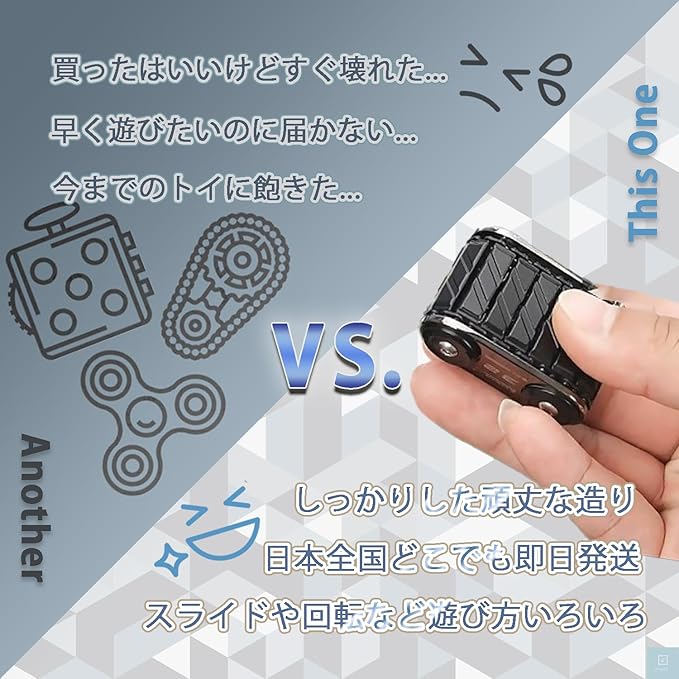 製品は合金素材で造られており、耐久性があります。構造はブルドーザーや戦車等に用いられるクローラー(無限軌道)になっているため、手に持つだけではなく机の上に置いて前後に動かして遊ぶこともできます。ポケットサイズであるため、携帯性にも優れており、デスクワークや学習の合間の気分転換、ストレス解消に役立ちます。またADHDや自閉症のためソワソワしてしまう時や集中が難しい時には、落ち着きを取り戻すのにも役立ちます。大人でも子供でも心を落ちつかせることは仕事や学習のパフォーマンスを高めるうえで大切なことです。このフィジェットを手の平で自由に動かすことで、注意深く考えてたり、アイデアが浮かんだり、ソワソワする気持ちを落ち着かせたりしてくれます。一人で退屈な時、手持無沙汰な時の手遊びに。オブジェとしてさりげなく置いておくこともできます。
