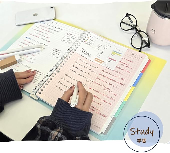 【付属品】6mm横罫ルーズリーフ5枚、6mm復習罫ルーズリーフ5枚、えんぴつで書けるインデックス大5山+小5山、クリアポケット1枚
