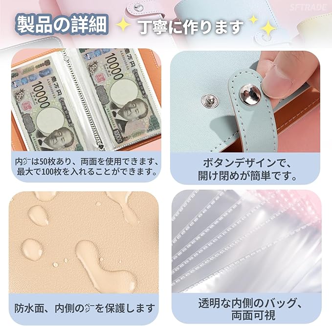 【SFTRADE】お札 貯金箱 お金仕分け 封筒貯金 ファイル バインダー お札 おしゃれ 貯金計画 災害グッズ コンパクトサイズ (内側のページ 50 ページ、現金100枚を積み重ねることができます)(水色)