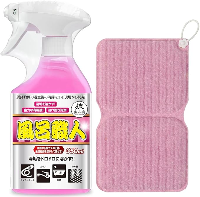 風呂職人 500ml バススポンジ セット 頑固な お風呂 汚れ 水垢 除去 掃除 クリーナー 洗浄剤 日本製 (ピンク)
