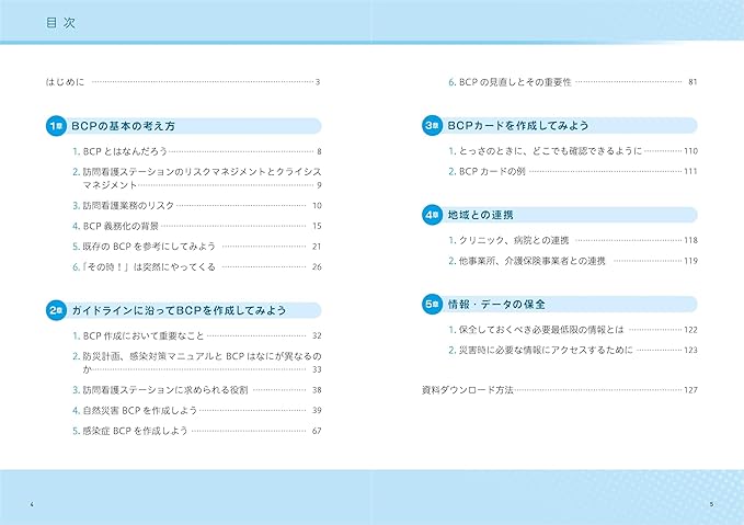 BCPの策定は、単に書類を整えるだけではありません。災害時においては、限られた人的資源、物品などを用いて、サービス提供の優先順を的確に捉え、従業員の安全を確保しつつ、継続して利用者に必要なサービスを提供する必要があります。本書では、訪問看護ステーションの現場で活用できるよう、実際の状況を想定した実践的なアプローチと手順を分かりやすく解説しています。また携帯に便利なBCPカードのサンプルも用意しました。