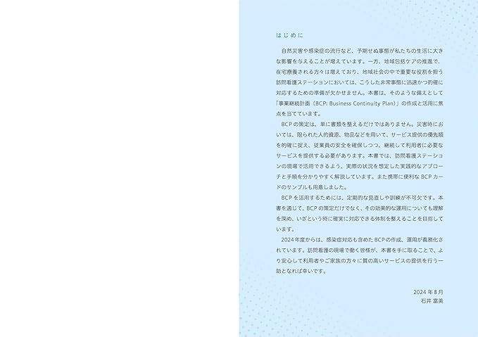2024年度からは、感染症対応も含めたBCPの作成、運用が義務化されています。訪問看護の現場で働く皆様が、本書を手に取ることで、より安心して利用者やご家族の方々に質の高いサービスの提供を行う一助となれば幸いです。