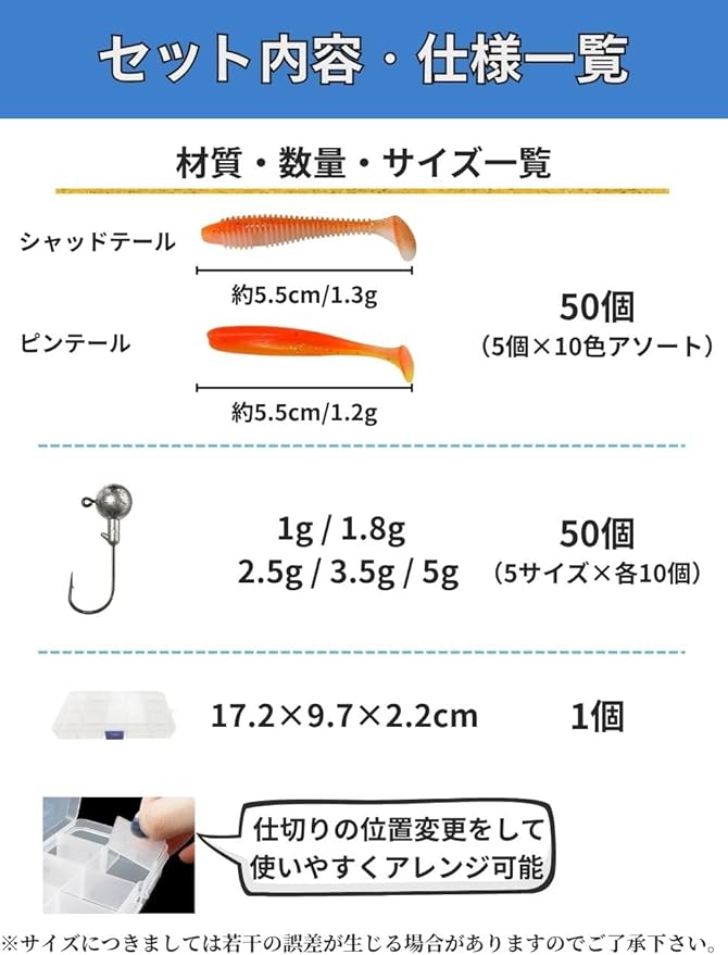 【商品仕様】〇セット内容:ワーム50個(5.5cm、10色アソート)、ジグヘッド50個(1g、1.8g、2.5g、3.5g、5g 各10個)、収納ケース1個。〇バリエーション→①シャッドテールAタイプ : ワームカラー(ホワイト、ブラック、オレンジ、ピンク、イエロー、グリーン、夜光、ドジョウ、ブルー、ロブスター)、②シャッドテールBタイプ : ワームカラー(ブラック、オレンジ、ピンク、イエロー、グリーン、夜光、オレンジホワイト、グレーホワイト、ブルー、ブラックゴールド)、③ピンテール: ワームカラー(ホワイト、ブラック、オレンジ、ピンクホワイト、イエロー、グリーンイエロー、夜光、ドジョウ、ブルーホワイト、ロブスター)。〇素材 : ワーム(PVC)、ジグヘッド(鉛・タングステン鋼)。※ケースに入っているワーム、ジグヘッドの箇所は多少異なるケースがあります。※サイズにつきましてはあくまで目安のため若干の誤差が生じる場合がありますのでご了承下さい。※商品写真はできる限り実物と近づけるようにしていますが、お使いのモニター設定、お部屋の照明等により実際の商品と色味が異なる場合があります。※海外製品のため日本製のものと比べて細かいところで雑に見えるものや多少の誤差がある場合があります。恐れ入りますが予めご了承ください。