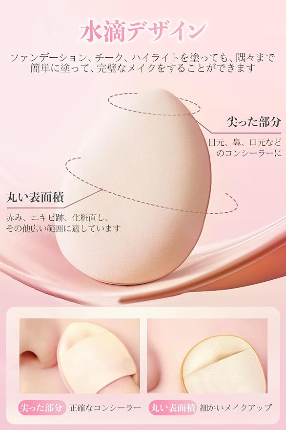 【超柔らかで高弾性のスポンジ素材で肌に優しい】高品質なスポンジを使用し、肌触りが非常に柔らかで、きめ細かい仕上がりを実現。弾力性に優れているため、ファンデーションを均一に伸ばせ、粉ムラや毛穴への詰まりを防ぎます。メイクがより精緻で自然な仕上がりに。