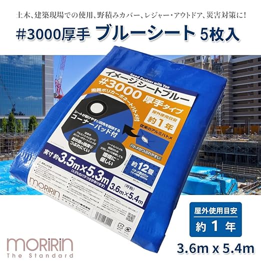 モリリン ブルーシート レジャーシート 5枚セット イメージシートブルー #3000 厚手 3.6 5.4m ポリカーボネートハトメ 使用目安約1年