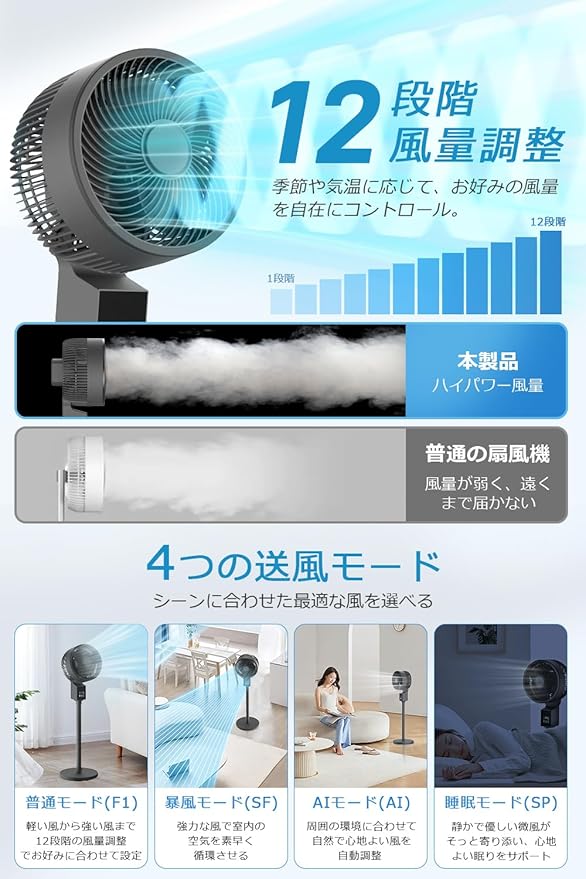 【使用シーンに合わせて自在に調整!4モード 12段階風量で一年中活躍】 通常・ストーム・AI・スリープの4つの送風モードと、12段階の風量調節で、自分だけの快適な風を細かく設定可能。AIモードは温度や湿度に応じて自動で風量を調整し、環境に応じた最適な送風を実現。ストームモードでは力強い風で素早く空気を循環、スリープモードでは静かで優しい風が快適な眠りをサポート。タッチパネルとリモコンの両対応で、離れていても簡単操作が可能です。
