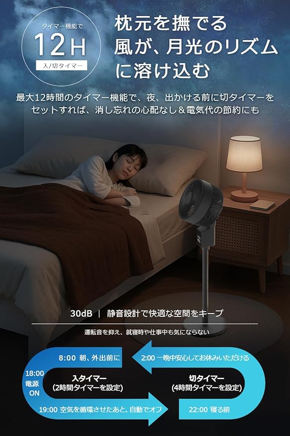 ⏰【静音性 12時間タイマーで生活リズムに寄り添う、ストレスフリーな送風体験】 30dB以下の超静音設計で、深夜や赤ちゃんのいる部屋でも音が気にならず、安心して使用可能。12時間の入・切タイマー機能により、就寝前や起床時間に合わせて自動運転の設定ができ、無駄な電力消費を抑えながら快適な生活をサポートします。在宅ワーク中や勉強部屋でも集中力を妨げることなく、常に心地よい空気環境を提供します。