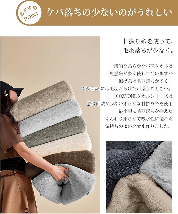 「しっかり、たっぶりの吸水力」 ちょうどいい太さにこだわっって、高密度の糸を使用量感あるロングパイルの優れた吸水性で、最初からスツと水分を吸ってくれます。さらに通気性が良いため、水分を素早く乾かします。入浴後の水分をサッと吸収する抜群の吸水力です。さらりとした快適な使い心地です。