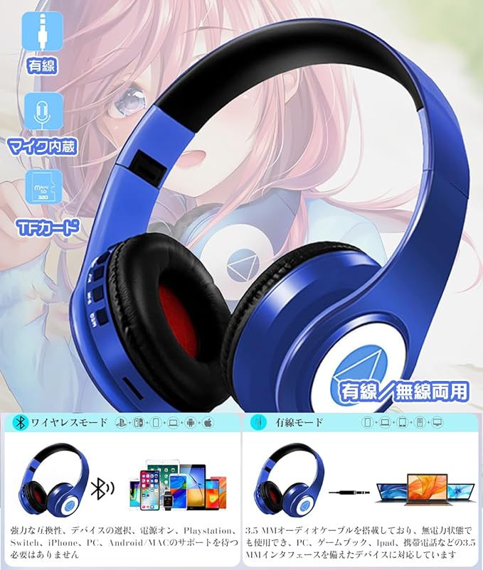 Topsky 中野三玖(Nakano Miku) コスプレ ヘッドフォン Bluetooth 5.0 Bluetoothヘッドホン ワイヤレス マイク内蔵 中野三玖 折りたたみ式 イヤホン アニメ風 ケーブル着脱式 コスプレ 音楽 クリスマス/ハロウィン/イベント/大人/学生/プレゼント 日本語取扱説明書付き