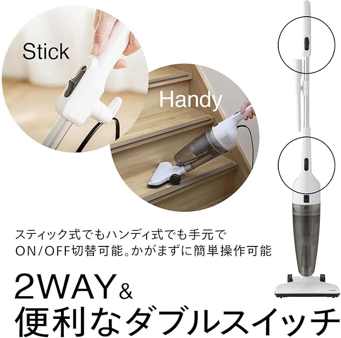 【便利なダブルスイッチ】スティック式でもハンディ式でも手元でON/OFF切替可能。かがまずに、簡単操作が可能です。