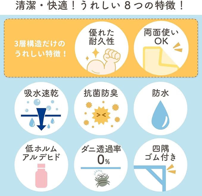 【お子様との添い寝や大人用としてもOK】大人用のセミダブルベッドサイズなので小さいお子様との添い寝をするときに便利です。おむつ外しトレーニング中のお子様にもオススメです。お子様用としてはもちろんのこと、ご自宅や病院での介護用として、またペットの粗相対策としてソファカバーやカーペットの下へ敷くなど、幅広い用途でご使用いただいてます。