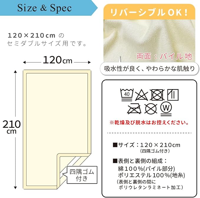 【両面使えるリバーシブルタイプ】両面ともパイル生地にして、四隅のゴムもリバーシブル対応にしました。両面使えることで2倍長持ち。
