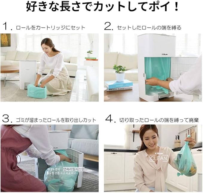 【好きな長さにカットしてポイ!】 ロール式のゴミ袋だから、使った分だけカットして捨てることができます。 ロールをカートリッジにセットしたら、EZkanの扉を開けてロールを下に引っ張ります。ロールの端を縛ればセット完了。 ゴミがたまったら、本体付属のカッターでカットして、切り取ったロールの端を縛って捨てるだけ! ごみ捨てのたびに、新しいゴミ袋を設置する手間を省くことができるので、忙しいママにおすすめです♪