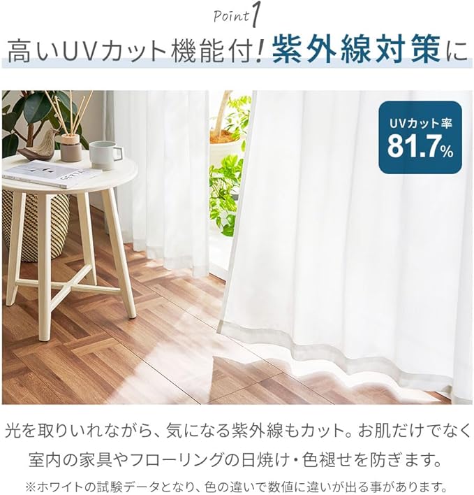 【UVカット機能付で日焼け対策】光を取りいれながら、気になる紫外線もカット。お肌だけでなく室内の家具やフローリングの日焼け・色褪せを防ぎます。※ホワイトの試験データとなり、色の違いで数値に違いが出る事があります。