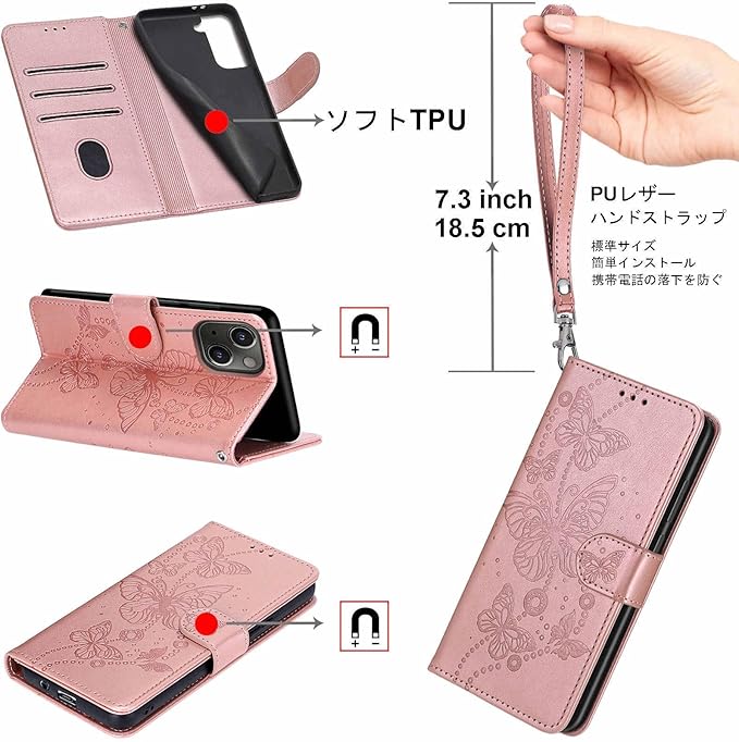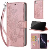 iPhone XR ケース 手帳型 対応 iphone xr 財布型 携帯カバー iphonexrスマホケース 高级PUレザー 耐衝撃 耐摩擦 全面保護 ホルダーバンプパタカード収納 軽量 手触りが良い 人気上品な シンプル気質 ギフト ローズゴールドの蝶