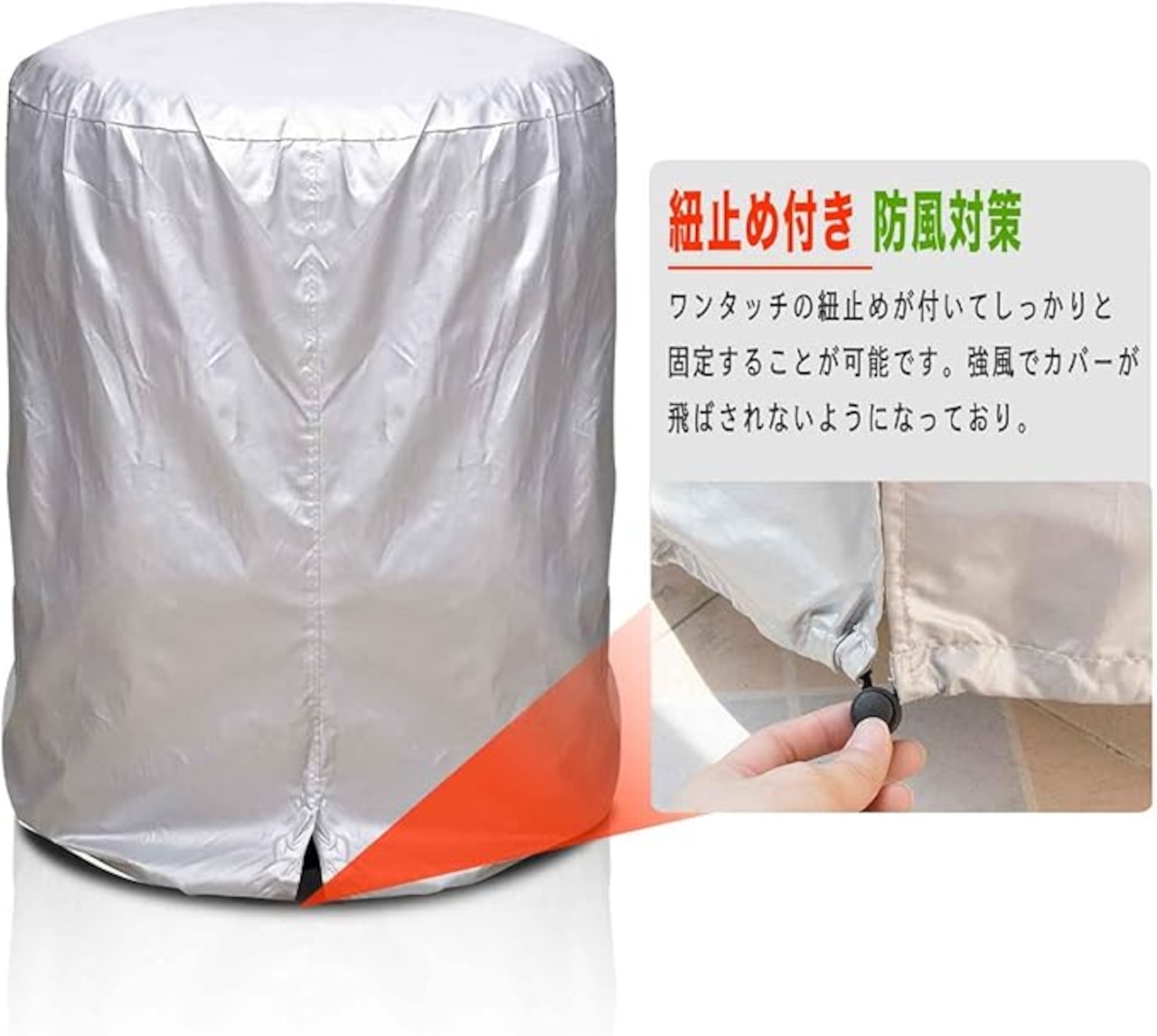 【台風対策の固定システム】 裾の強化紐でタイヤ底面に確実に固定。強風で剥がれず、特殊ステッチで隙間から塵が侵入しません。