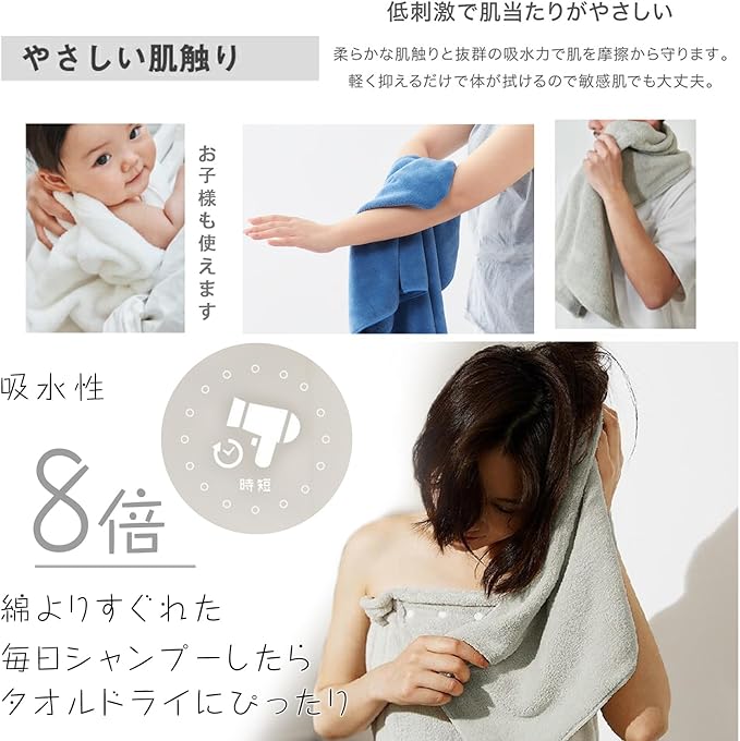 【マイクロファイバーとは】マイクロファイバーの細さは髪の毛の100分の1しかありません。繊維表面の目に見えない凹凸の間にある、細かな隙間が水分に触れたとき、毛細管現象を起こして水を吸い上げます。高い吸水力を誇るやわらかな肌触りのマイクロファイバー製の吸水フェイスタオルです。