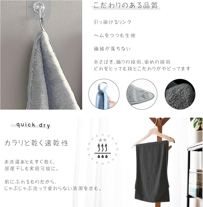 【乾きやすくてお洗濯が楽!高品質のタオルをお届けします】 じゃんじゃん使える!業務用にも強化を加えた特製タオル。乾きが速くて、丈夫でお洗濯もコンパクト。いくら絞っても形は崩れないしほつれ防止のためヘムの周りはしっかりと縫い合わせています。独特の吊り輪付き、引っ掛けやすい収納便利。長くご愛用いただけるよう、フェイスタオル周りを丁寧に加工しています。また、有害物質を含まない天然染料を使用しています。何度洗っても色落ちや抜け毛がない