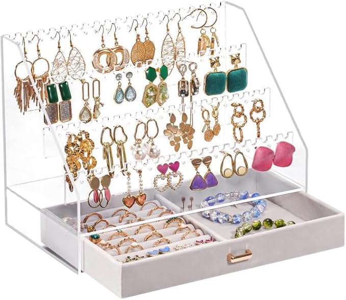 容量:4段ラックが最大36組のイヤリング・ピアスを収納できます;底部の引き出しがあり、指輪や時計などの保管も可能です。
