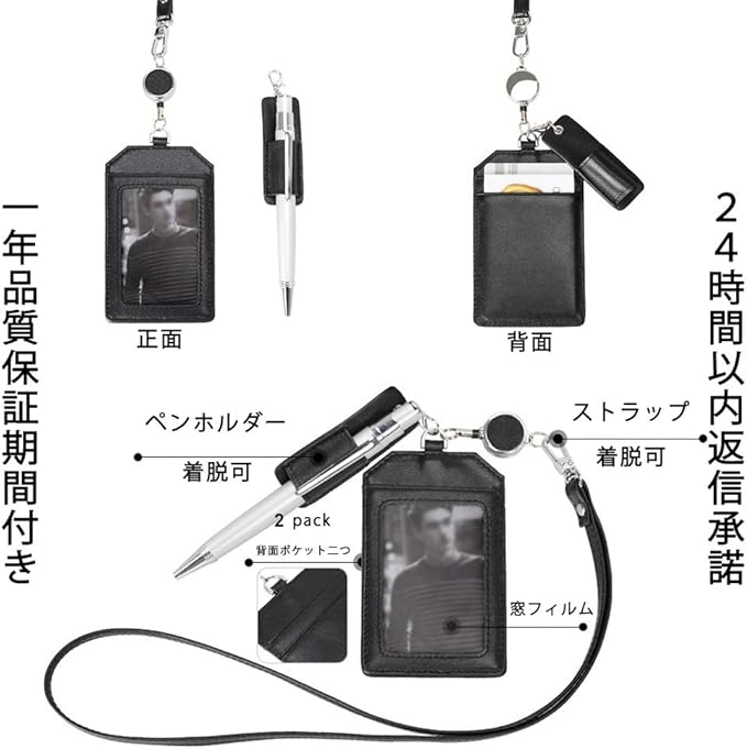 【リール付き&着脱可能ペンホルダー】:リールを伸ばして「最長40cm」手を離すと自動的に戻ります。背面ポケット二つありますのでsuicaなど便利に使えます。着脱可能なペンホルダーは様々なシーンで利用できます。