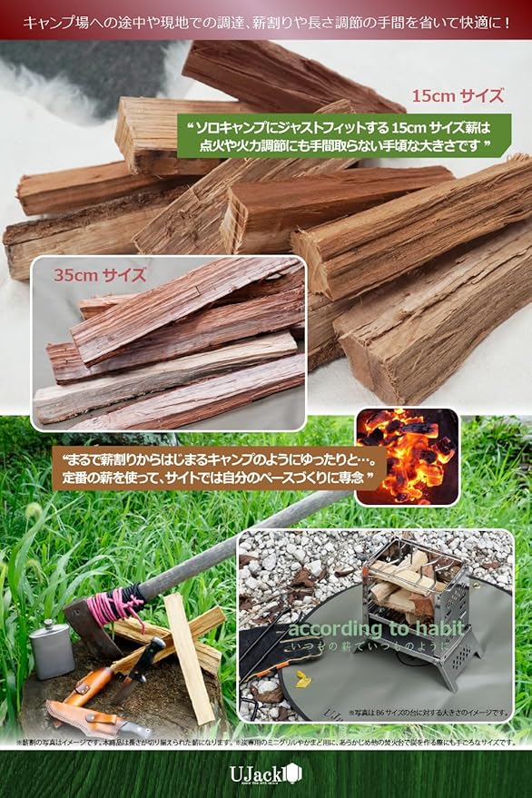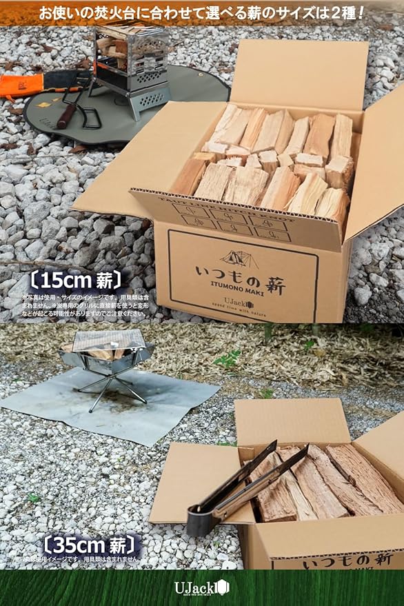 選べる2つの薪サイズ 「ITUMONO MAKI」は、キャンプ場での薪調達や薪割りの手間を省き、使いやすさと快適さを追求。15cmと35cm、2種類のサイズをお好みや用途に合わせてお選びいただけます。どちらも高品質な国産広葉樹を使用し、日本国内にて焚き火に適した水分量に人工乾燥され丁寧に生産されています。