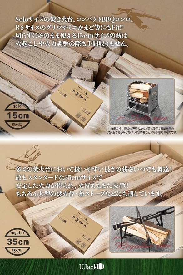 製品仕様 Soloサイズ(15cm):約376mm 約256mm 約154mm(重量:約5~7kg) Regularサイズ(35cm):約376mm 約256mm 約154mm(重量:約5~7kg) 材質: 国産 広葉樹(人工乾燥天然薪) 生産国: 日本