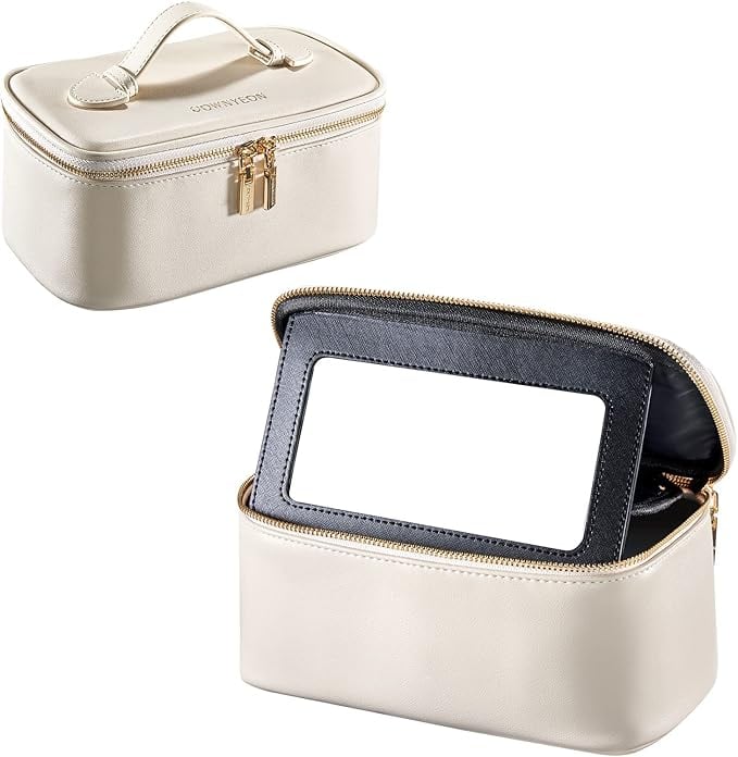 Rownyeon コスメボックス 鏡付き メイクポーチ 大容量 持ち運び 仕切り 化粧ポーチ メイクボックス 小物入れ 韓国 バニティポーチ 限定商品 ブラシポケット付き トラベル 防水 軽量 かわいい おしゃれ 化粧道具 (ホワイト)