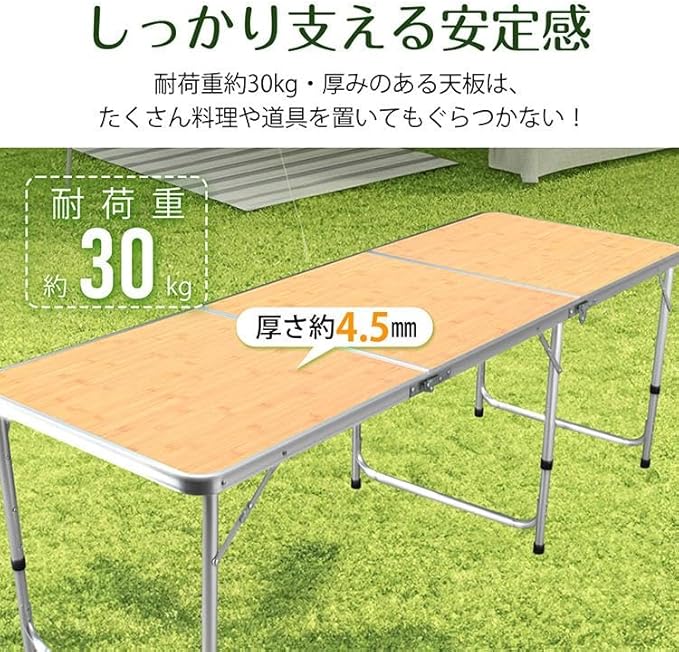 【アルミ素材で軽量&高耐久】本体は高品質なアルミニウム合金でできており、軽さと頑丈さを両立。サビにも強く、屋外でも安心して長く使えます。【耐荷重約30kgで安心の安定性】最大30kgまでの重さに耐えられる構造で、食器や調理器具を置いてもぐらつかず、安心して作業ができます。【全長180cmのワイドサイズ】展開時の幅は約180cmもあり、複数人で囲む食事や作業にもゆとりをもって対応できる大型サイズです。【省スペース収納で自宅保管にも便利】収納時のサイズはわずか約60 61 9.5cmと非常にコンパクト。押し入れや物置に立てかけておけるので、保管に困りません。【工具不要で簡単設置】設置に工具は一切不要。脚部を広げて固定するだけなので、初めての方でもすぐに使える手軽さが特徴です。