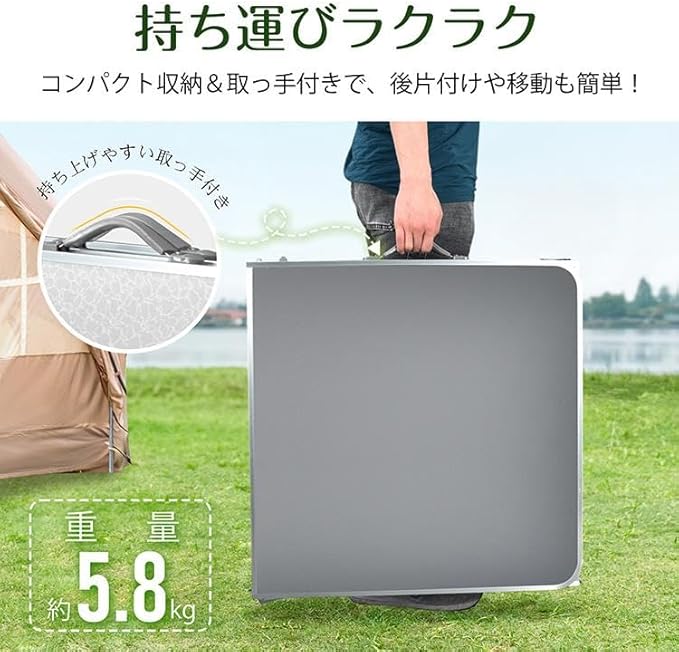 【収納バッグ不要のスマート収納】本体にハンドルが付いているため、別途収納バッグを用意する必要がなく、スムーズな持ち運びが可能です。【雨や汚れにも強いアルミ天板】表面は水や汚れに強いアルミ製なので、雨天時の使用や汚れた食器の置き場としても安心して使用できます。【アウトドア初心者にもおすすめ】設置や撤収が簡単で、軽量で扱いやすいため、初めてキャンプをする方や女性にも扱いやすい設計です。【平らな天板で作業効率アップ】ガタつきのないフラットな天面設計で、パソコン作業や書き物にも適した使い心地を実現しています。【急な来客時の簡易テーブルにも】収納しやすく取り出しやすいので、来客時やホームパーティーでの臨時テーブルとしても非常に便利です。【スマートにアウトドアを楽しむ】無駄を省いたシンプルで洗練されたデザインは、見た目にも美しく、アウトドアシーンを格上げしてくれます。