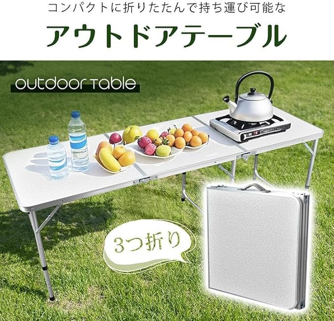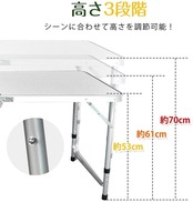 【アウトドアに最適な折りたたみテーブル】広々とした天板と実用的なサイズ感で、キャンプ・BBQ・ピクニックなどあらゆるシーンで大活躍するアウトドア専用テーブルです。【高さ調整は3段階!使い方自由自在】高さは約53cm、61cm、70cmの3段階に調節できるので、子供から大人までシーンに合わせた最適な高さで使用できます。【3つ折り構造でスリムに収納】テーブルは3つ折り構造になっており、使わない時はコンパクトにたたんで保管が可能。収納スペースを取らず、自宅でも車内でも場所を取りません。【取っ手付きでどこへでも持ち運べる】収納時はアタッシュケースのように持ち手がついており、女性や子供でも楽に持ち運べる携帯性の高さが魅力です。