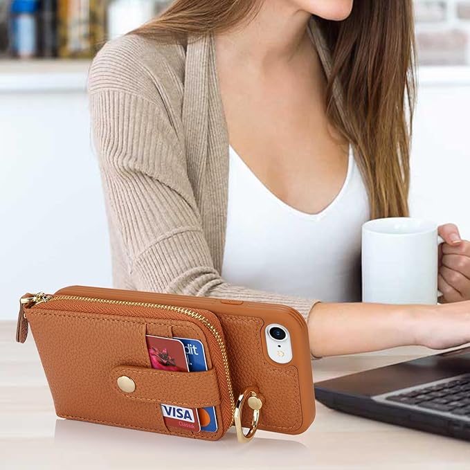 for iPhone SE 2022 / Se 2020 / 8 / 7 通用 ケース 肩がけ 長さ調整 首掛け 斜め掛け ファスナー ストラップ付き SunYoo ショルダー リング付き 手帳型 アイフォン スマホケース アイホン Case カバー ブラウン