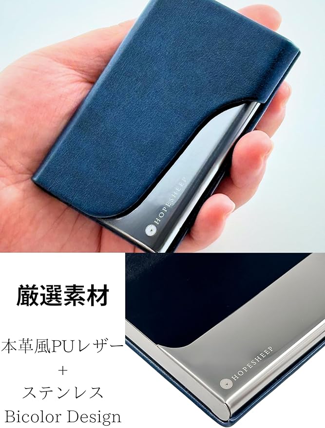 PUレザー(マイクロファイバーレザー)とステンレス素材を組み合わせた、シンプルでおしゃれなデザインの名刺入れです。メンズ レディース どちらも違和感なくご使用いただけるデザインの名刺いれ なので、幅広いシーンやスタイルにマッチすることができます。
