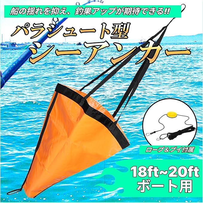 【商品説明】 風の強い中、船体を安定させるのに役立つのがこのパラシュートアンカーです。釣りなどをしているときに、船体を安定させるために大いに役立ちます。本商品は、広くボート、たとえばスタンドアップパドルボート、パワーボート、セイルボート、カヌー、カヤック、インフレータブルボート、そして帆船、ヨットなどにもご利用頂けます。船の大きさに応じた、シーアンカーのサイズをご用意させて頂いております。商品内容は、バラシュートアンカー、フロート(ブイ)、そしてカラビナ付きロープのセットですので、すぐにご利用頂けます。パラシュートアンカーは、PVC(ポリ塩化ビニル)製です。二層構造で二重に出来ているので、丈夫で、耐久性に優れています。また、折り畳み式かつ軽量設計なので、利用時・持ち帰り時の持ち運びにも便利です。