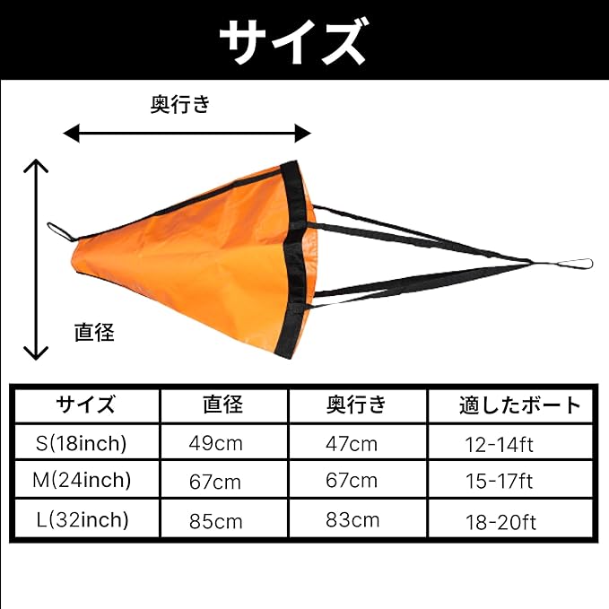 【特徴:①アンカーの機能・②シーアンカーの回収に役立つフロート・③コンパクトな収納】 ①パラシュートアンカーは、横風でボートが流されそうになったとき、海流を捉えることでボートを安定化させます。海流によって船体が大きく流されてしまうと不安になるかもしれませんが、パラシュートアンカーが捉える海流は、表面の海流よりも比較的穏やかなため、表面の海流ほどには流れません。 ②フロートをつけることで、使用中にパラシュートアンカーが海底に沈むことを防ぎ、海中でパラシュートアンカーが海流を捉えやすくします。また、回収時にはパラシュートアンカー側のロープを引き上げるのではなく、フロート側のロープを手繰っていくことで、パラシュートアンカー全体を回収することが容易になります。 ③利用後、パラシュートアンカーは水洗いをして、干して十分に乾かして下さい。パラシュートアンカーには折り目がありますので、コンパクトにたたむことが出来ます。ブイのサイズも大きくないので、パラシュートアンカーおよびロープもまとめて収納できます。