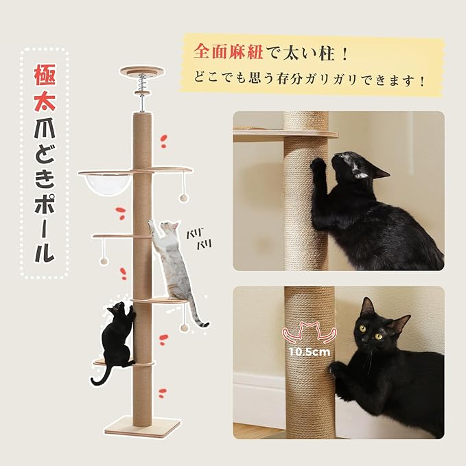 PAWZ Road キャットタワー 突っ張り 木製 全面麻紐 爪研ぎ 直径10.5cm 極太 スリム 大型猫用 猫タワー 木目調 夏 木登りタワー おしゃれ 多頭飼い クリアボウル 宇宙船付き 滑り止めマット おもちゃ 登りやすい インテリア 安定 運動不足解消 - ベージュ 高さ調整幅200.5-261.5cm