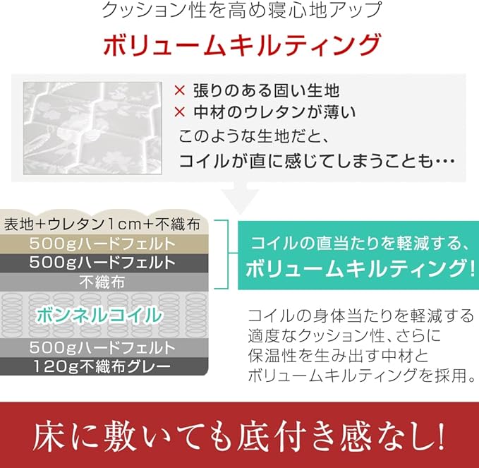【おすすめポイント!】 ・身体を面で支え、硬めの寝心地のボンネルコイルマットレス ・薄型だけど、床に敷いても感底付き感なし ・パイピングを施した高いデザイン性 ・ISO9001認定工場で生産した安心の品質