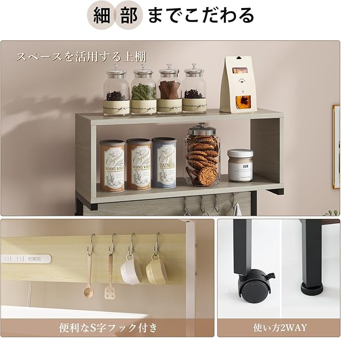 【キャスター付き・S字フック付き】ガタツク防止のアジャスターの他に、移動ラクラクなストッパー付きキャスターも付属しており、用途に合わせて自由に付け替えられる。タオル、カップなどキッチン用品の整理に便利なS字フック5個付き。