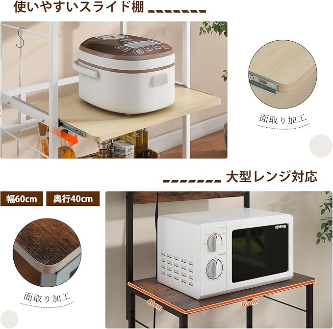 【使いやすいスライド棚】耐荷重5kgなスライド棚で必要な時だけ前に出せて便利。高品質な金属スライドレール付きでスムーズに出し入れできる。ポット・炊飯器置き台として大活躍!