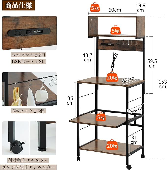 LYNCOHOME レンジラック 計4口 コンセント付き USBポート付き レンジ台 レンジボード 幅60 食器棚 キッチンラック キッチン収納 大型レンジ対応 キャスター付き(ブラウン ビンテージ ヴィンテージ)
