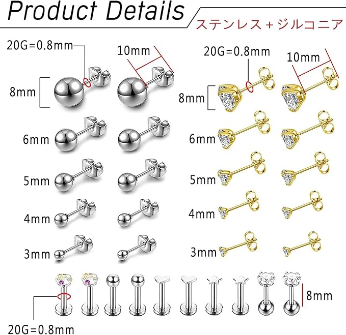 20G ボディピアス セット、おしゃれで存在感もあり、男性、女性ともにご着用可能です。