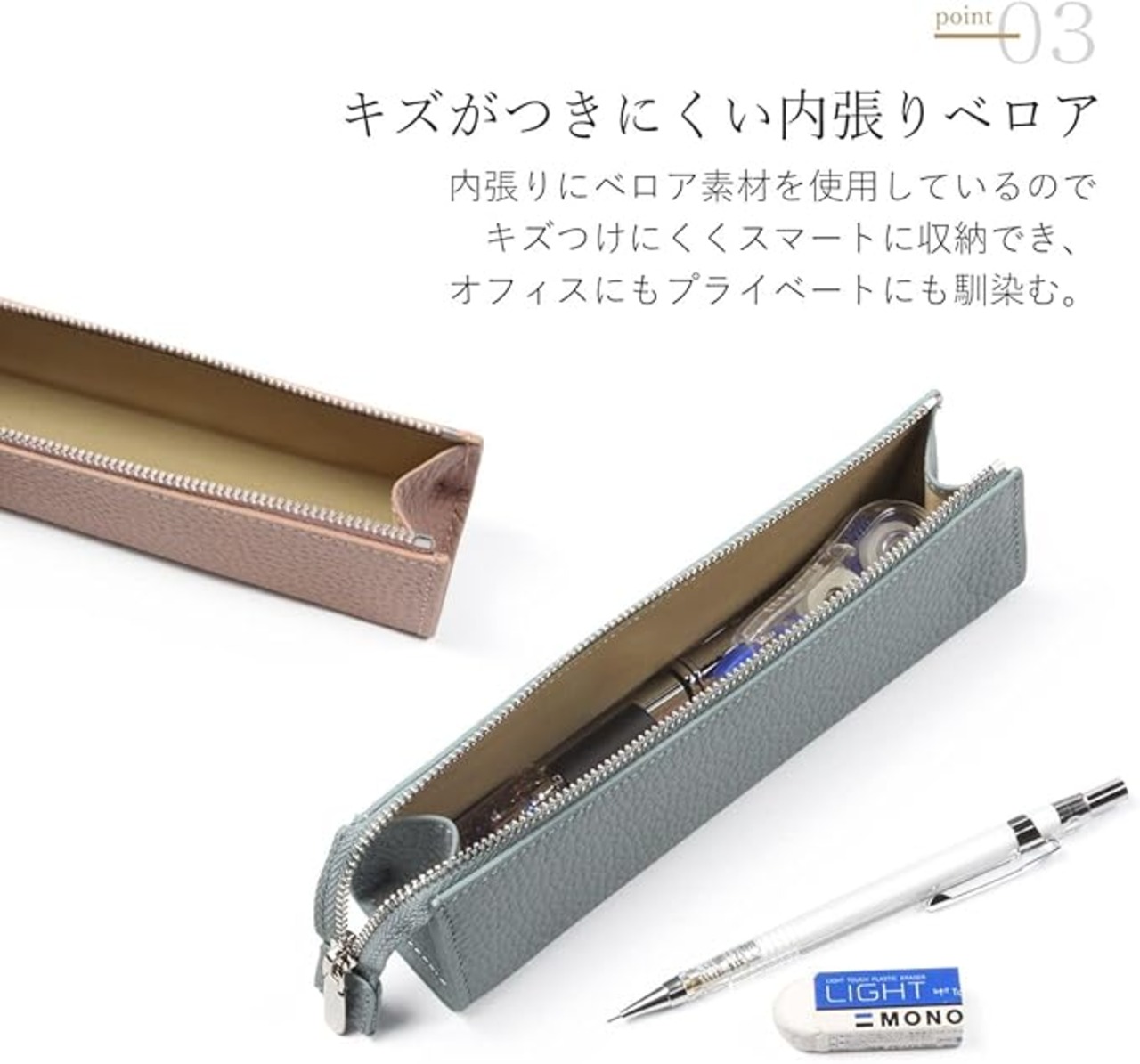 【透明感あるナチュラルカラー】 落ち着いた雰囲気のカラーラインナップ。 【本革だけの上質感】 くすみカラーのまっとなシボ革が好印象のペンケース。 【キズがつきにくい内張りベロア】 内張りにベロア素材を使用しているので傷つけにくく スマートに収納でき、オフィスにもプライベートにも馴染む。 【かさばらない】 外出時にもちあるくのにちょうどいい バックのなかでもかさばばらないスリムフォルム。