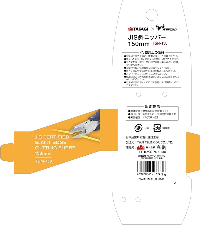 高儀(Takagi) TAKAGI TSUNODA JIS 斜ニッパー 150mm 電気工事 配線加工 機械修理 作業工具 切る 切断 カッティング プライヤー JIS認定 TSN-150