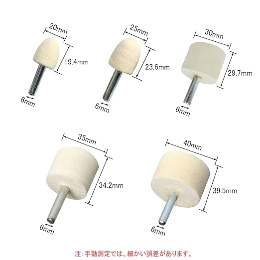 【セット内容】10点セット。円筒形:30 6mm 2本、35 6mm 2本、40 6mm 2本 円錐形:20 6mm 2本、25 6mm 2本 (ウール研磨ヘッド径 軸径)