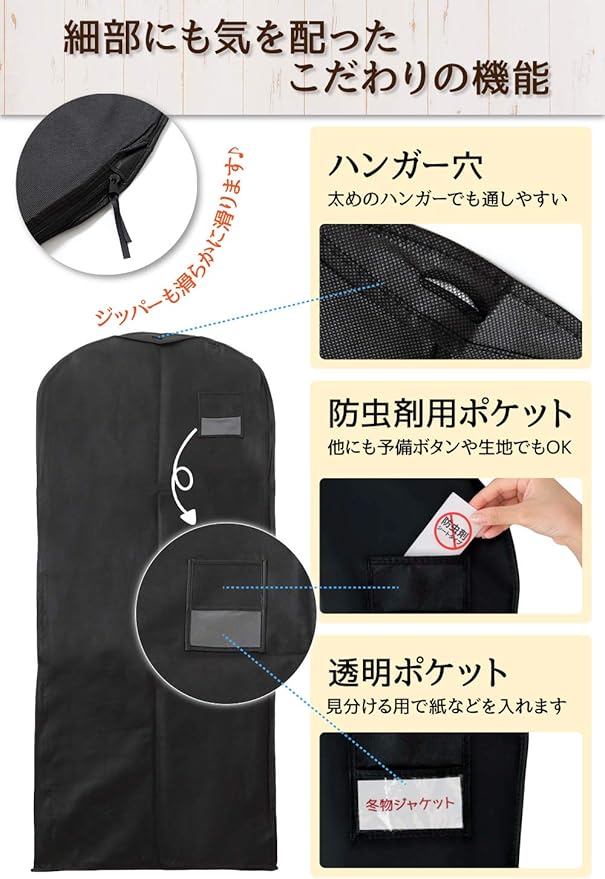 【実用的ポケット付き】胸元に2つのポケットがあります。深めポケットに、防虫剤やムシューダ、ボタン、余り生地などを収納することができます。メモ用ポケットは透明になっているため、収納した衣類についてのメモ書きを入れるのがおすすめです。※記載例としては、”ママ用コート”、”パパ用タキシード”等の書き方もできますし、ご自身だけのクローゼットに収納する場合は、限定商品名や品名などご記載いただくことで判別しやすくなります。